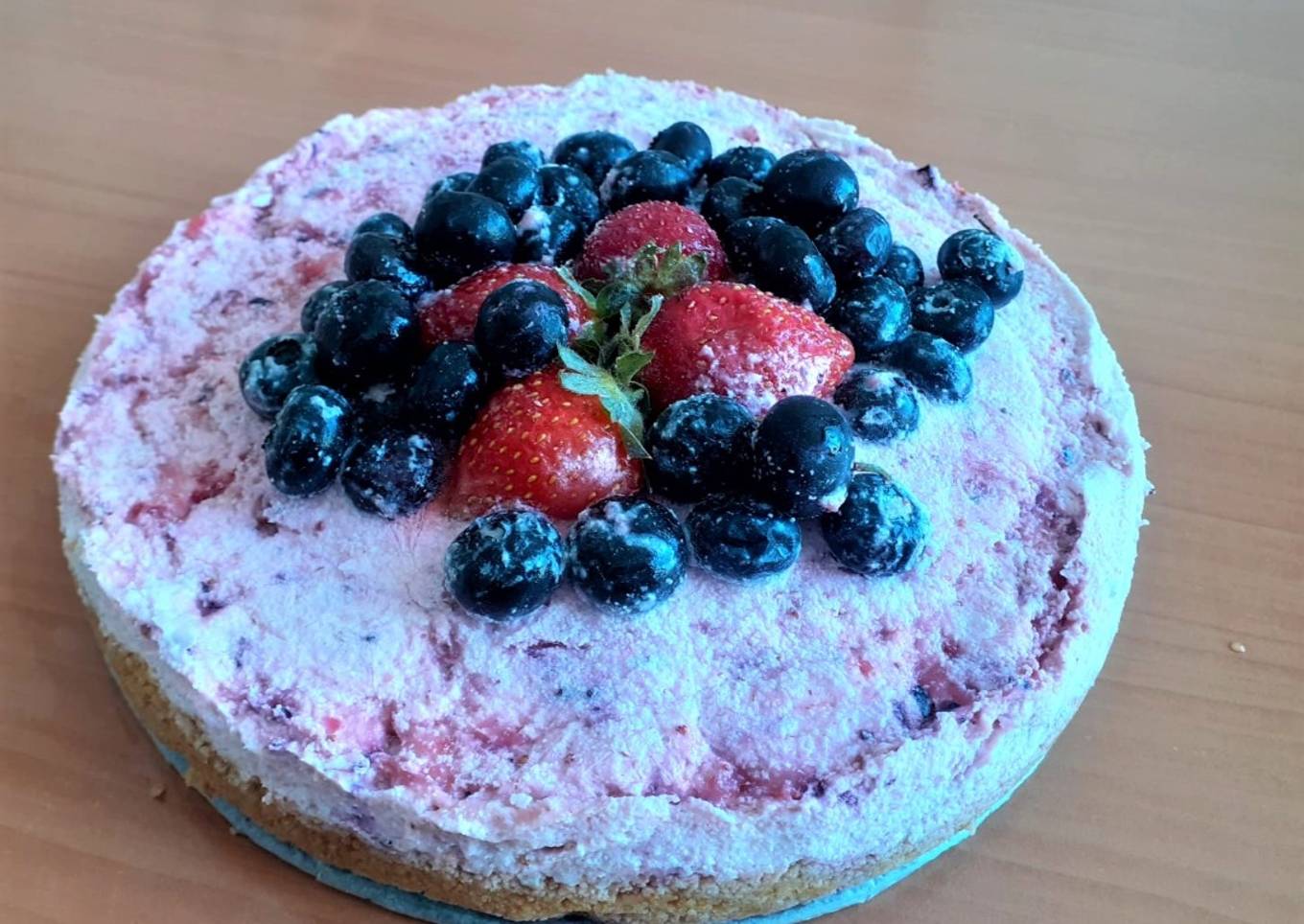 - Se decora al gusto con fresas y arándanos. Se deja en el congelador tapado al menos 8 horas.