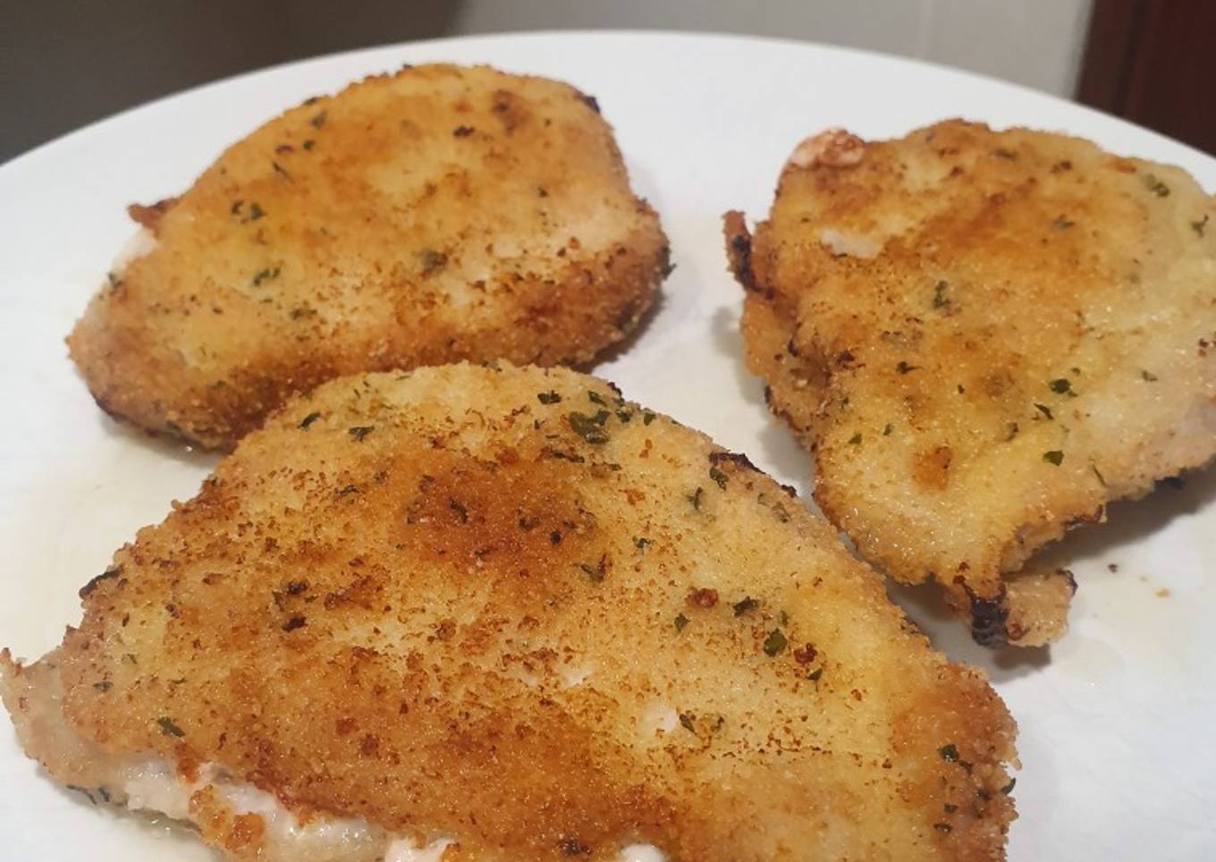 - Batir dos huevos en un plato y añadir una pizca de sal. En otro plato, pan rallado con perejil y un poco de ajo en polvo.