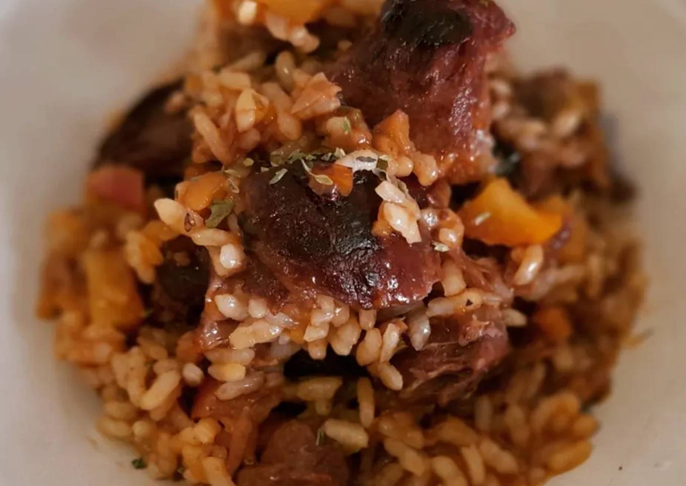 Arroz seco de carrilleras y manzana